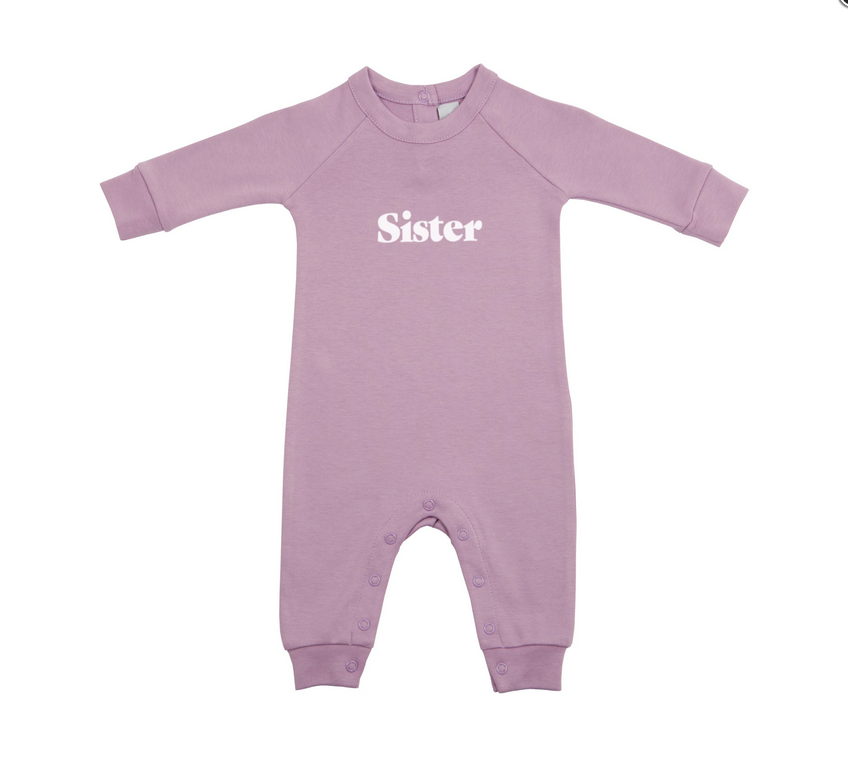 Violet cotton all-in-one featuring a white 'Sister' slogan.