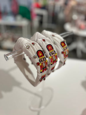 Spread holiday cheer with this playful White Nutcracker Christmas Headband. Adorned with beaded jewels, this headband adds a touch of whimsy to any outfit. The perfect accessory for your next Christmas party or family gathering. 'Tis the season to be festive!