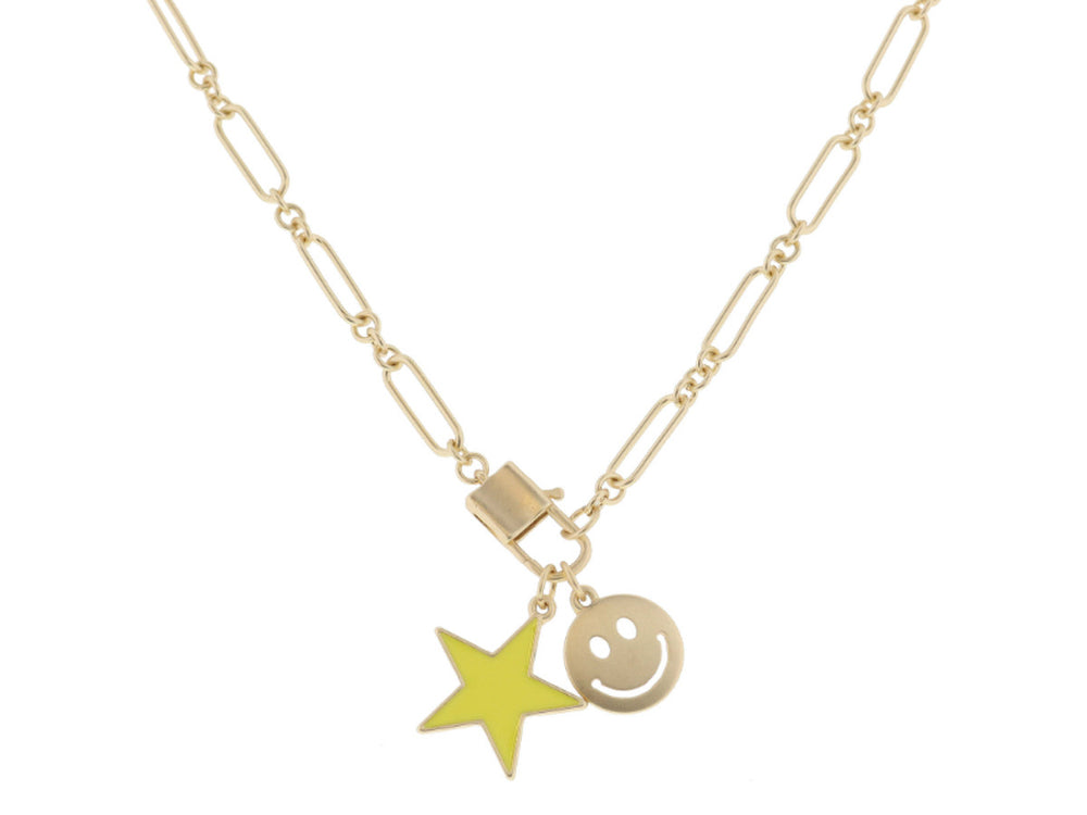 "Spread happiness with this 14" gold chain featuring a star and smiley charm. Perfect for adding a touch of playful style to any outfit. Makes a great gift for the star and smile lovers in your life." (Tone: playful, quirky)