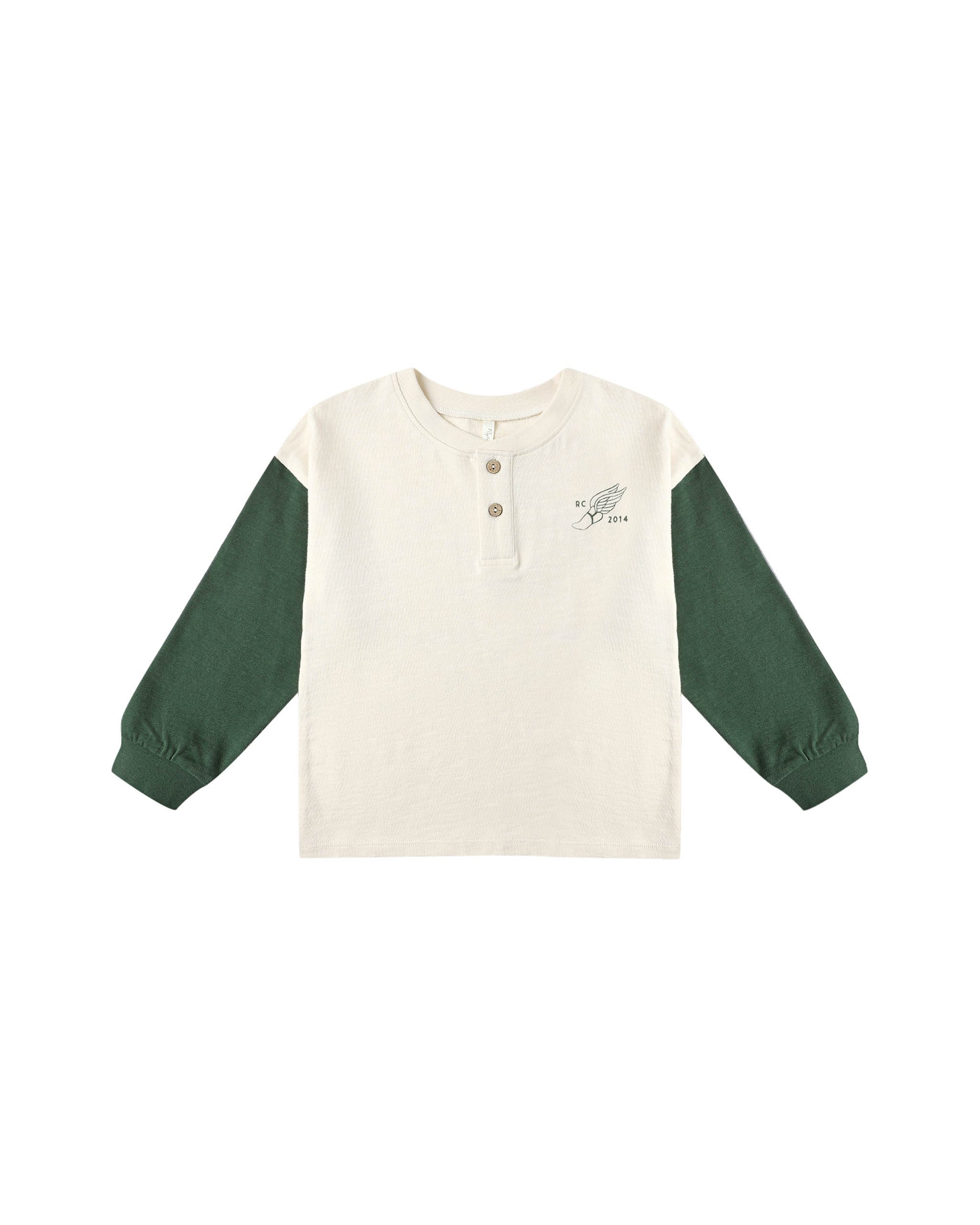 Add vintage track-and-field vibes to your wardrobe with this relaxed-fit long sleeve tee, featuring contrast sleeves and a center front button placket.