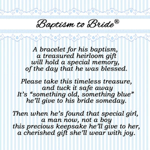 This sweet keepsake from our Timeless Collection.  Sterling silver keepsake baptism gift "Baptism to Bride®" bracelet gift for boys.  This special keepsake will be a treasure that can be worn on his Baptism day and then tucked away and given as a special gift for his bride someday her "something old and something blue".  This is designed with .925 sterling silver and beautiful blue high-end crystal and is hand-beaded here in the USA.  This comes with a sweet poem and includes a place to write his name and special dates along with a special gift box to tuck it away for that special day.  This is an heirloom they both will cherish forever.
