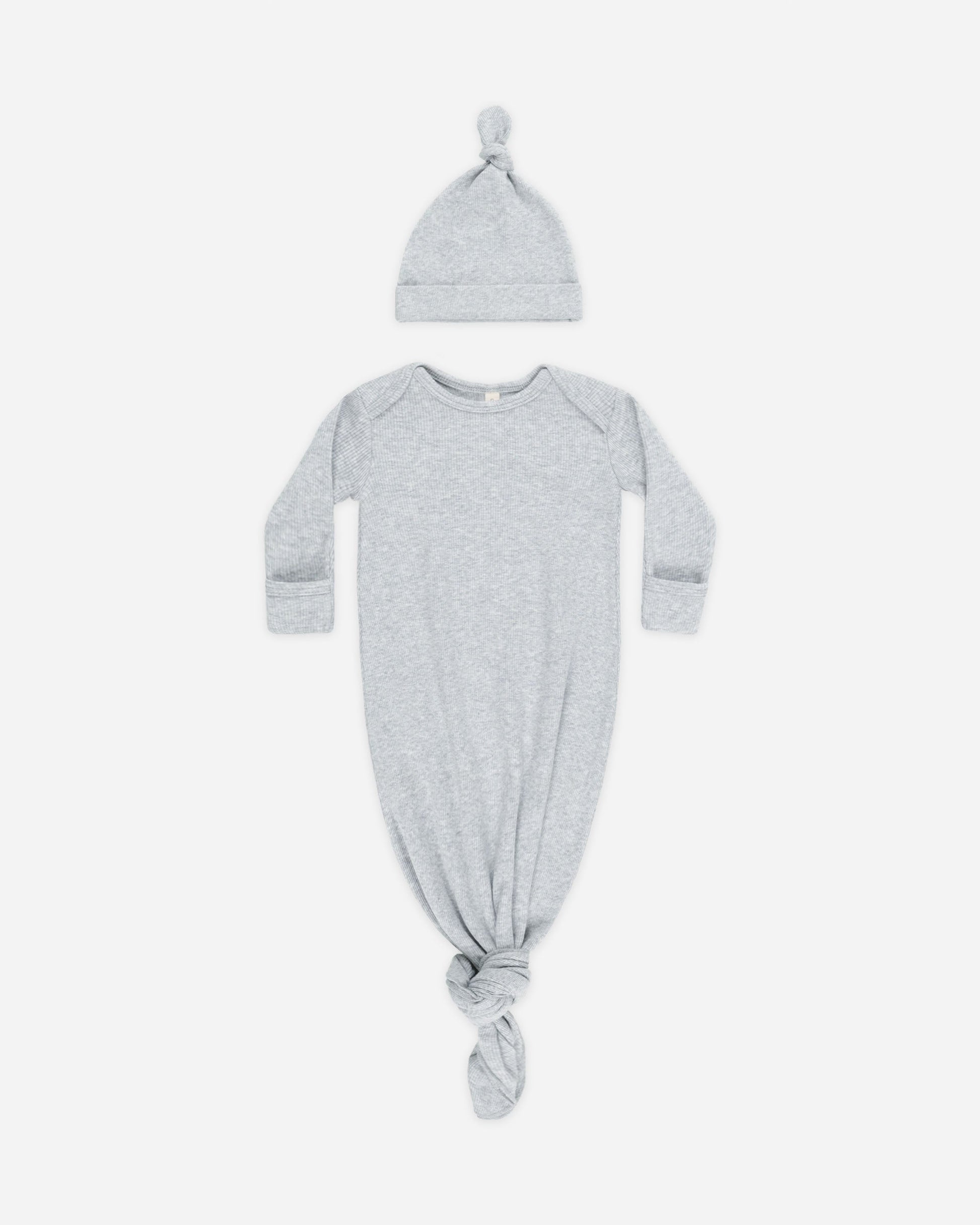 Self-tie Knotted Baby Gown designed with lap sleeves and fold-over hand mitts, paired with our knotted baby hat in our soft ribbed melange knit.