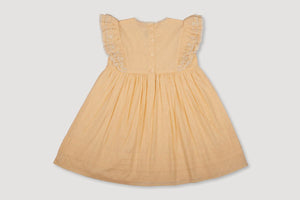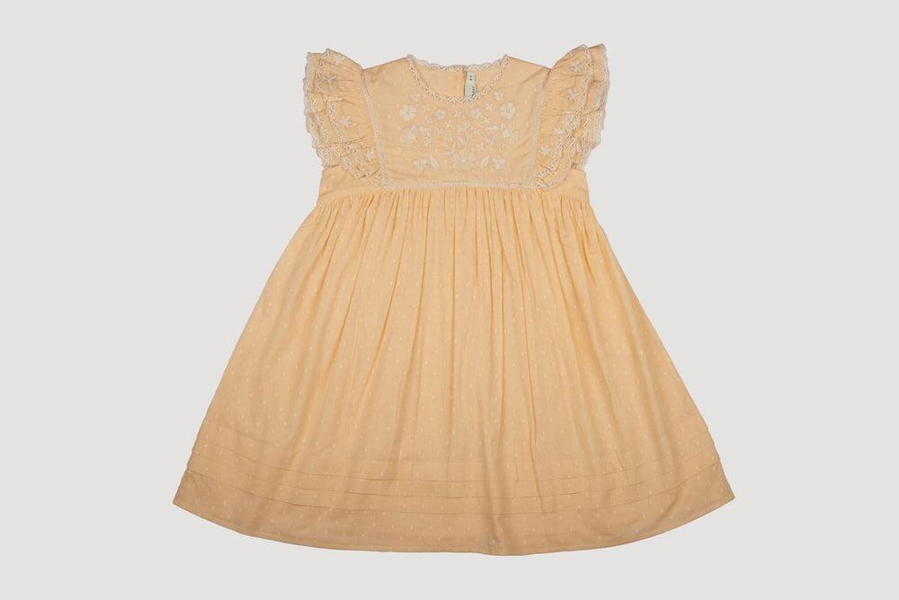 The Georgia Dress is a graceful and delicate creation made from soft cotton with a subtle dobby Swiss dot texture. Featuring intricate floral embroidery and lace accents, this piece combines refined elegance with a playful touch. Its flowing silhouette and flutter sleeves make it an ideal choice for both special moments and everyday charm.