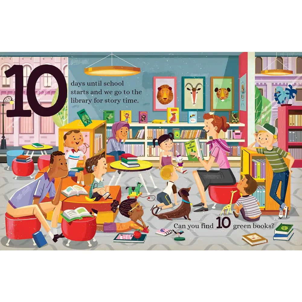 Greg Paprocki’s Countdown to School is the perfect board book to read with your little one who is either getting ready to begin preschool or who has an older sibling or friend heading to school in the fall. It's nine days until school starts, and what do we do? We go shopping for school clothes, of course! Three days before school starts, we talk about our feelings because it is okay to be a bit nervous. And two days before school starts, we organize our school supplies and pack them into our backpack. We are ready to go! Toddlers learn to count down from 10 to 1 as they mark the days until school begins, and they can practice counting by finding objects hidden throughout these fun back-to-school scenes in Paprocki’s classically retro mid-century art style.