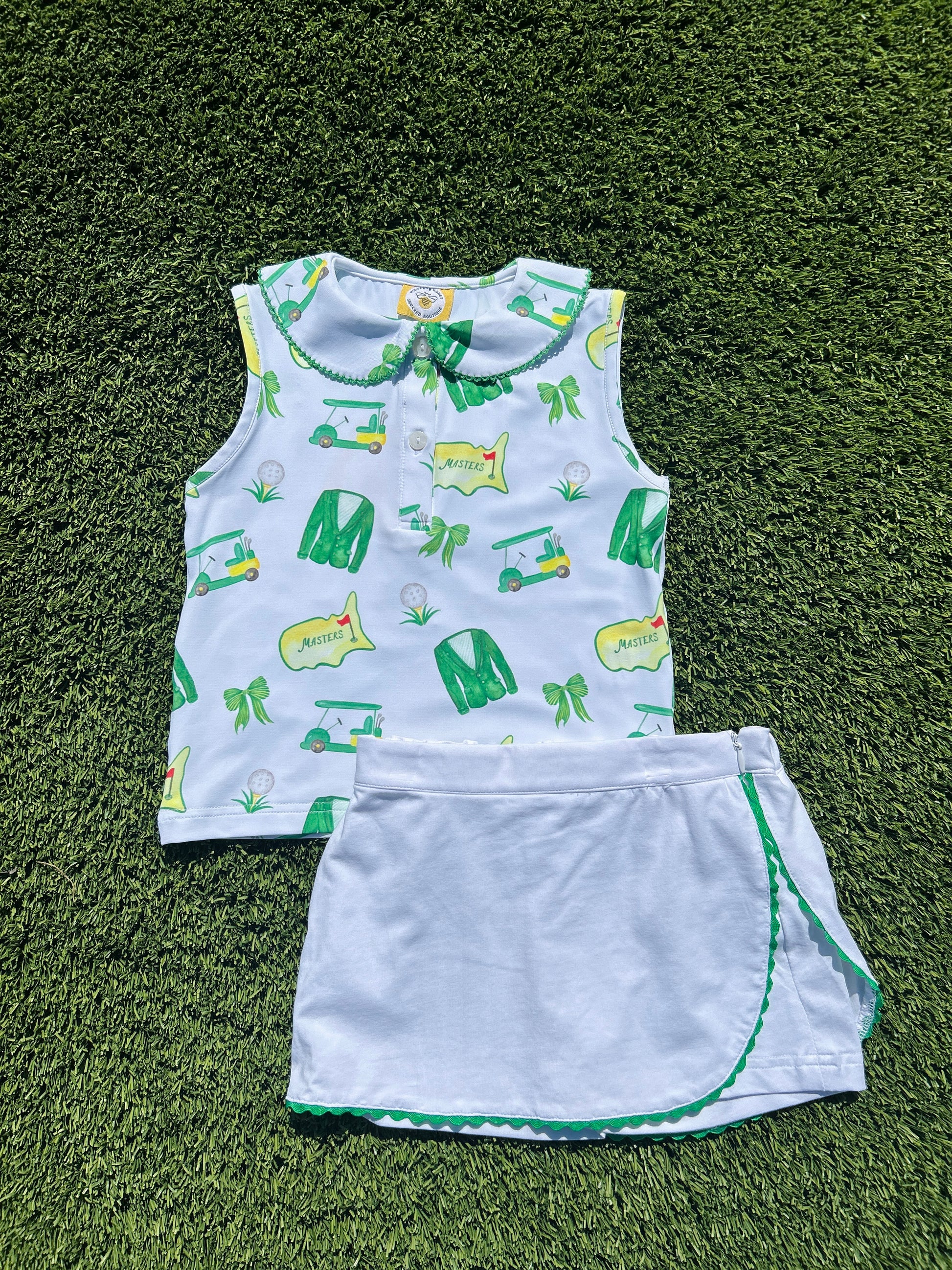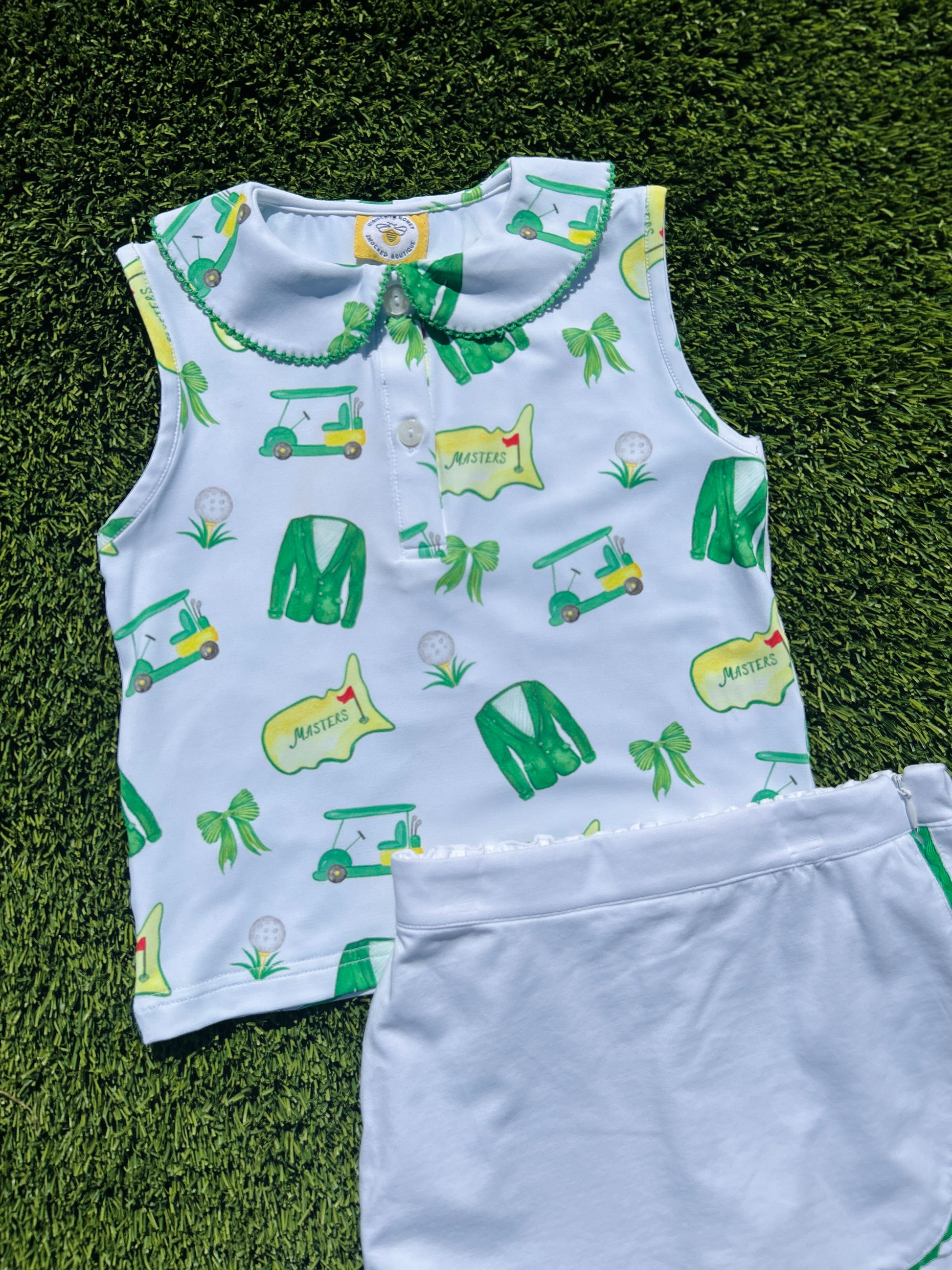 Elevate your little girl's golf game with our Hibiscus & Honey Hole in One Girls Knit Skort Set. Inspired by the Masters, the luxurious green and yellow design will have her feeling like a true champion on the course. Perfect for stylish and functional play, this outfit is a must-have for any future golf pro.