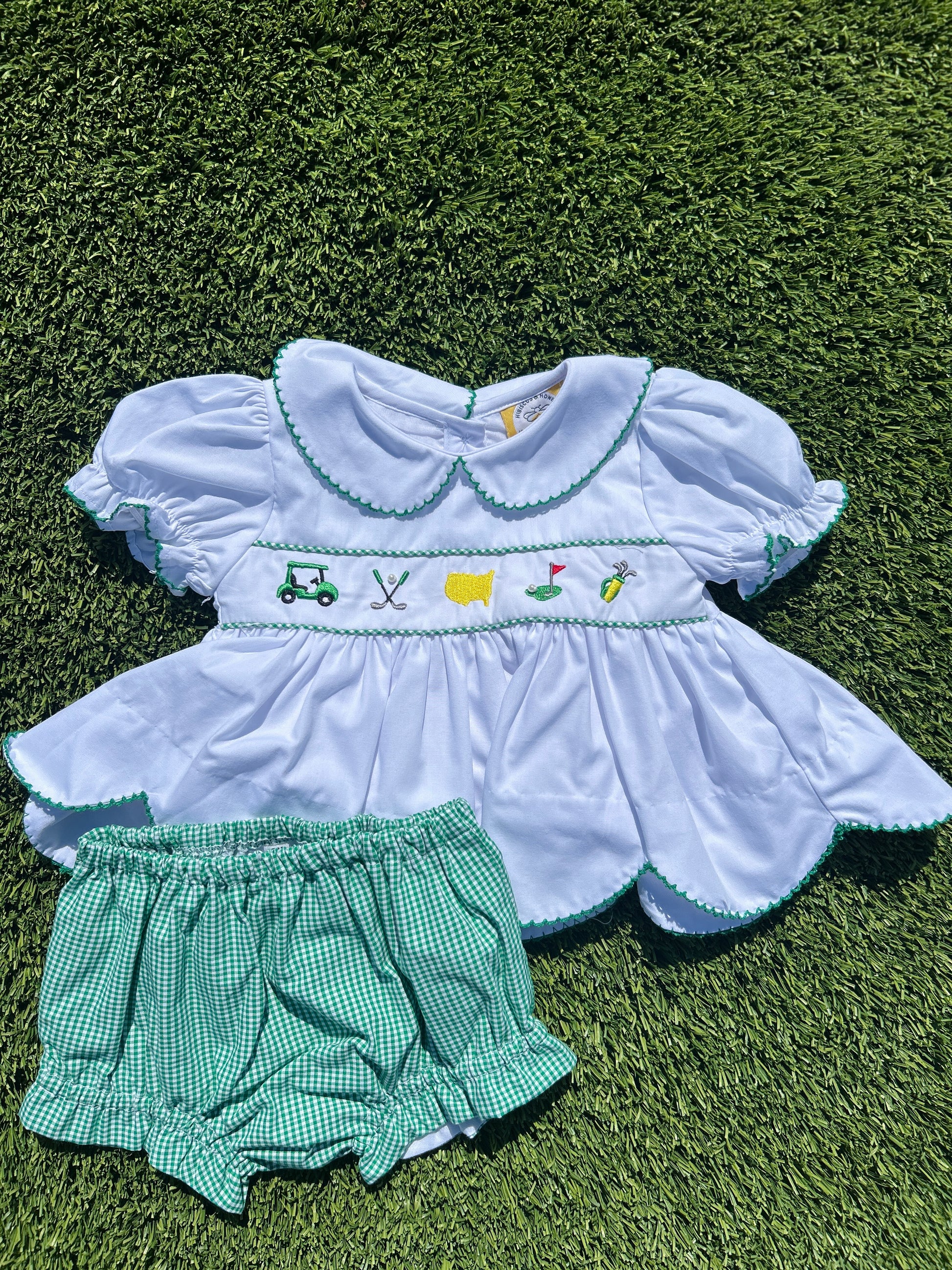 Elevate your little one's wardrobe with the Hibiscus & Honey - Par-Tee Woven Bloomer Set. This luxurious set features a masters inspired golf print that will have your child looking stylish on and off the course. Crafted with hibiscus and honey tones, this set exudes elegance and exclusivity. Perfect for any budding fashionista.