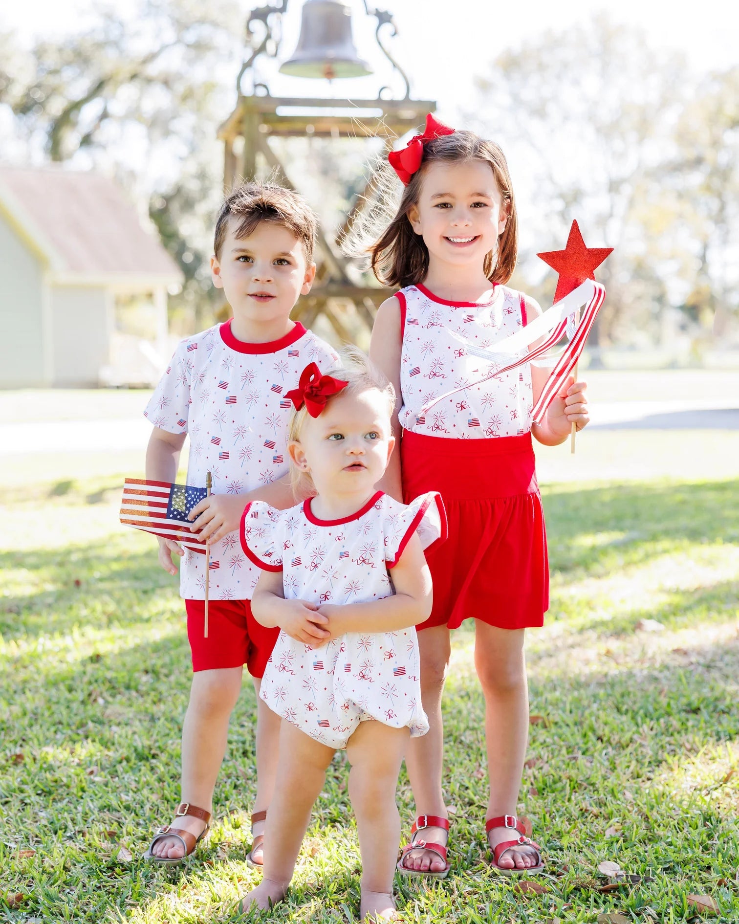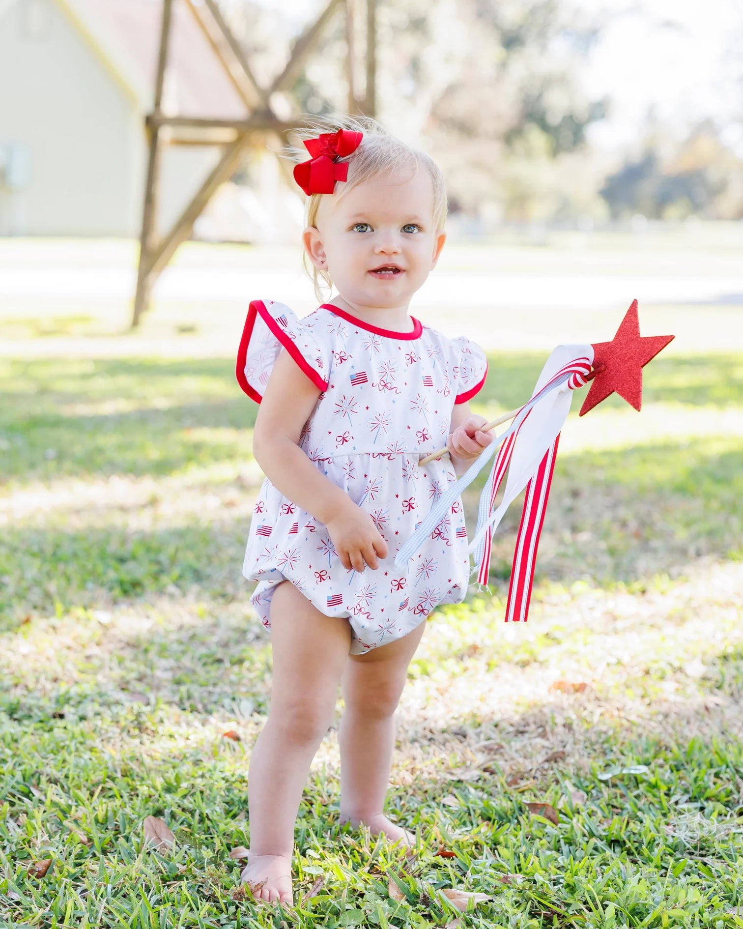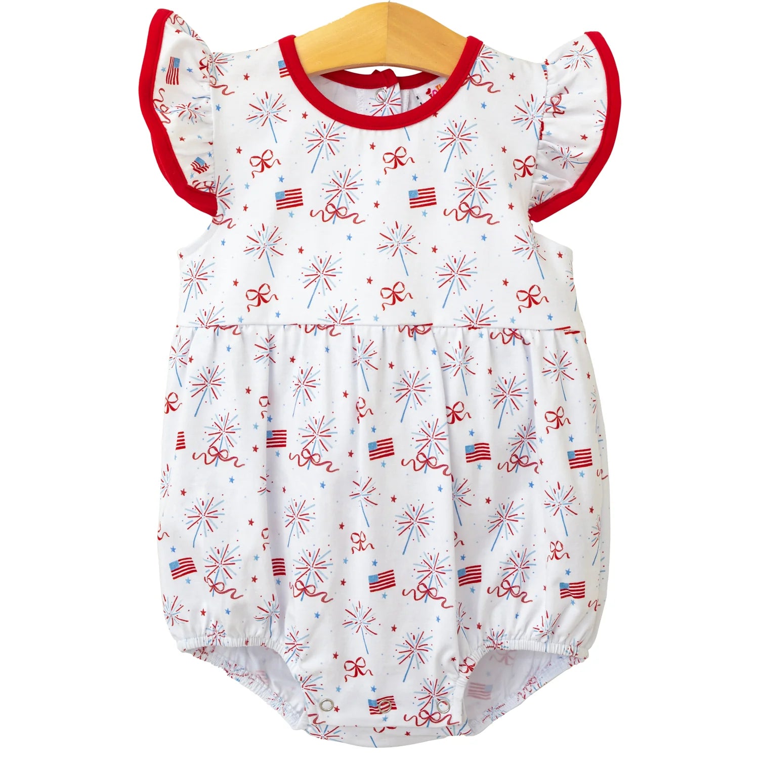 Set off a style explosion with our Fireworks and Freedom Flutter Bubble. The flutter sleeves add flare (and flutter!) to this playful bubble, while the patriotic fireworks and flag print will have your little one celebrating in style. Perfect for any summer celebration! 🎆