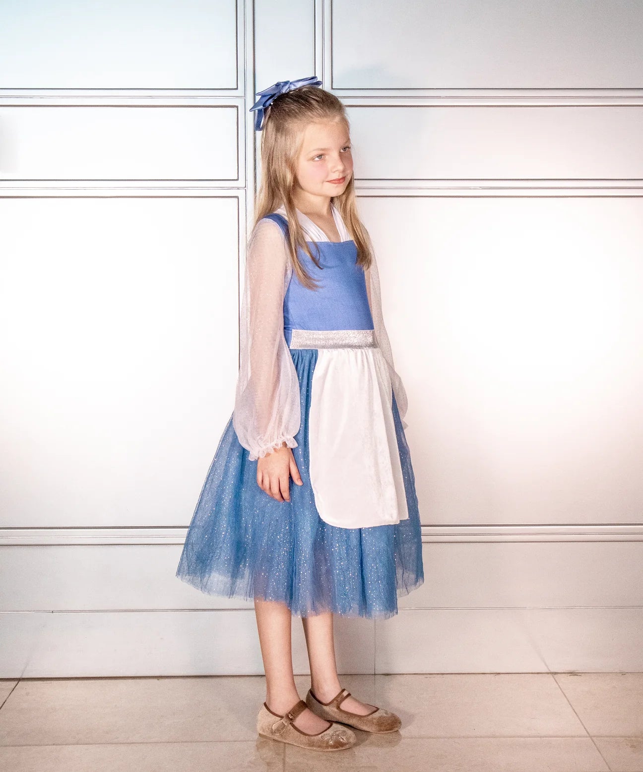 Crafted from soft stretch blue fabric, this dress ensures both comfort and elegance for your little princess. The classic white apron adds a touch of timeless charm, while the silver stretch belt provides a perfect, princess-worthy fit.