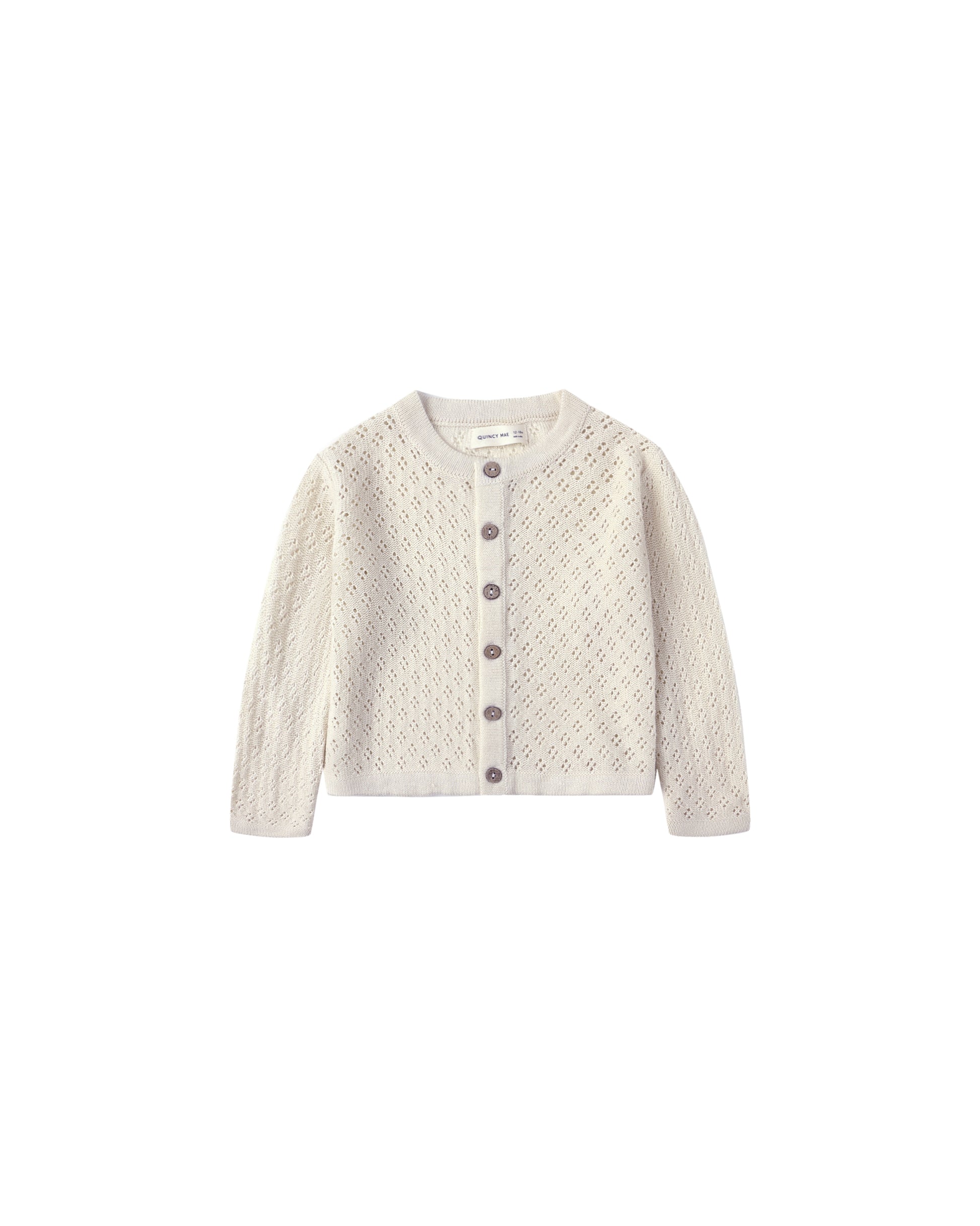 This darling cardigan showcases a beautiful pointelle knit design and coconut buttons for an extra sweet look.