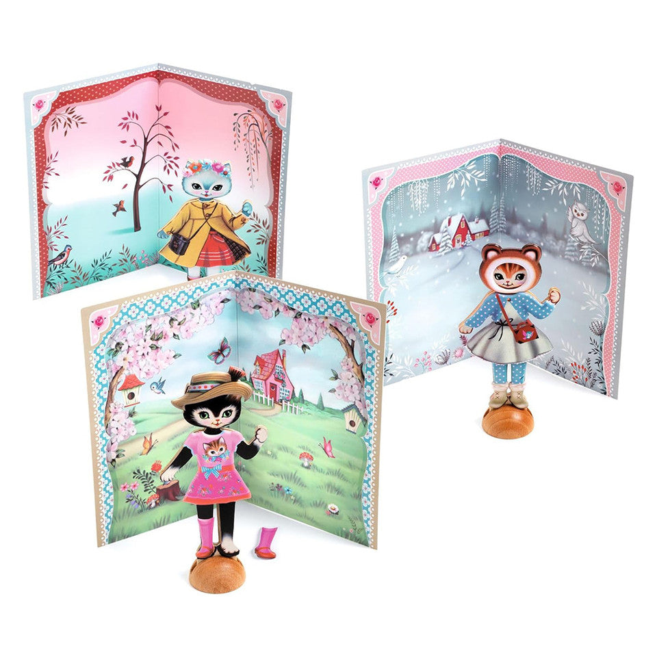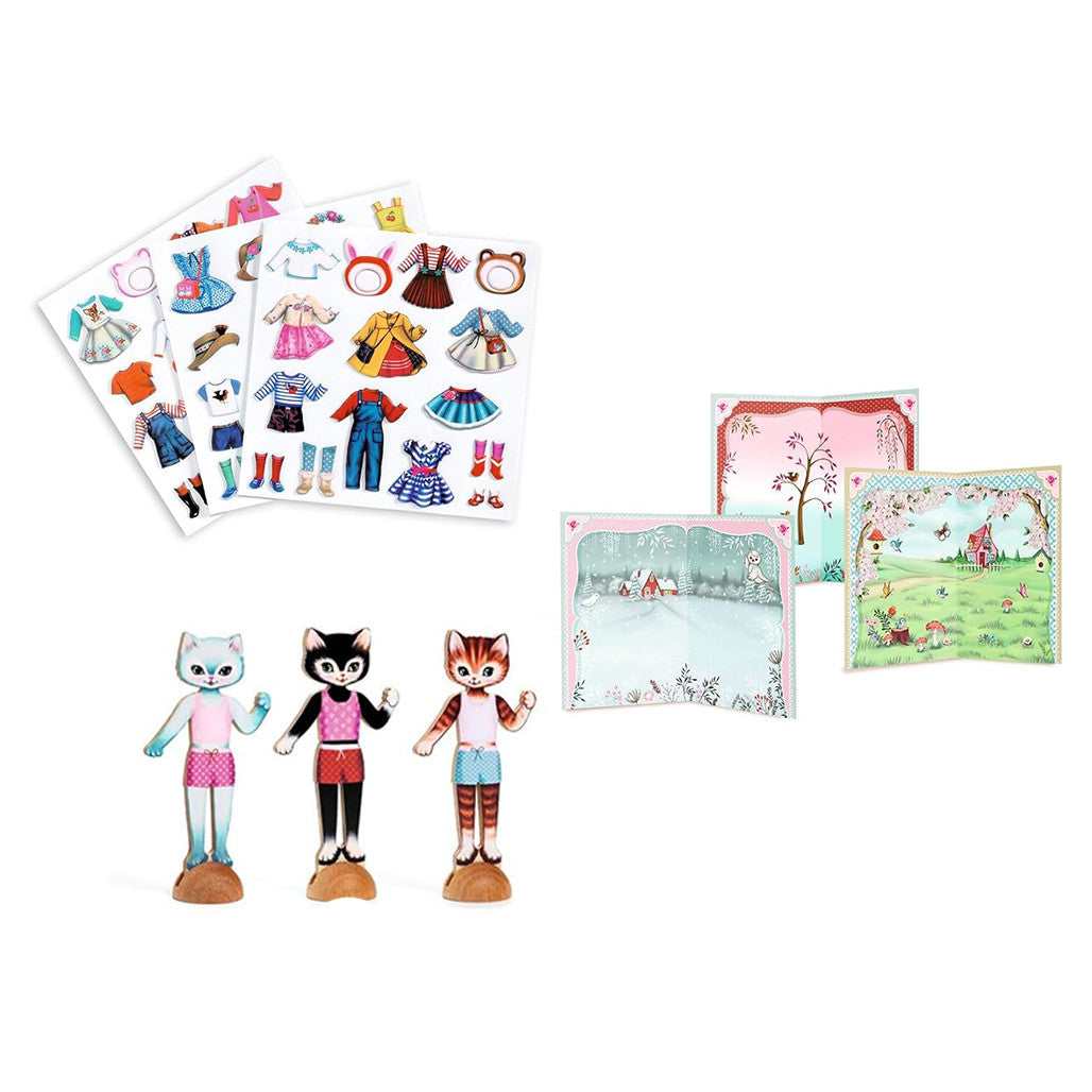Get ready for the catwalk! Inspire your child's love for fashion and textiles with this Djeco Little Wardrobe Collage Kit. This adorable kit lets kids dress up 3 wooden cats with over 65 reusable stickers, creating endless clothing combinations and silly stories.