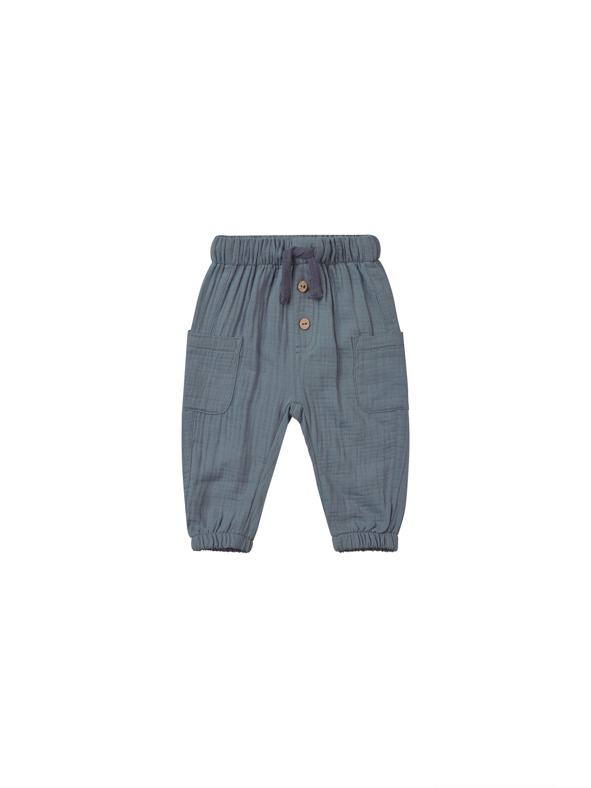 Comfortable corduroy pants with an elastic waistband and leg openings, adjustable drawstring, and side patch pockets.