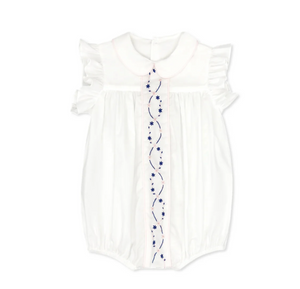 Indulge in luxury with our Lullaby Set - Kimberly Bubble Blessings. Crafted with a white collared bubble and delicate flutter sleeves, adorned with pink and blue detailing. Perfect for making a sophisticated statement and blessing your little one with a touch of elegance. Available in white, blessings pink, and richmond royal.