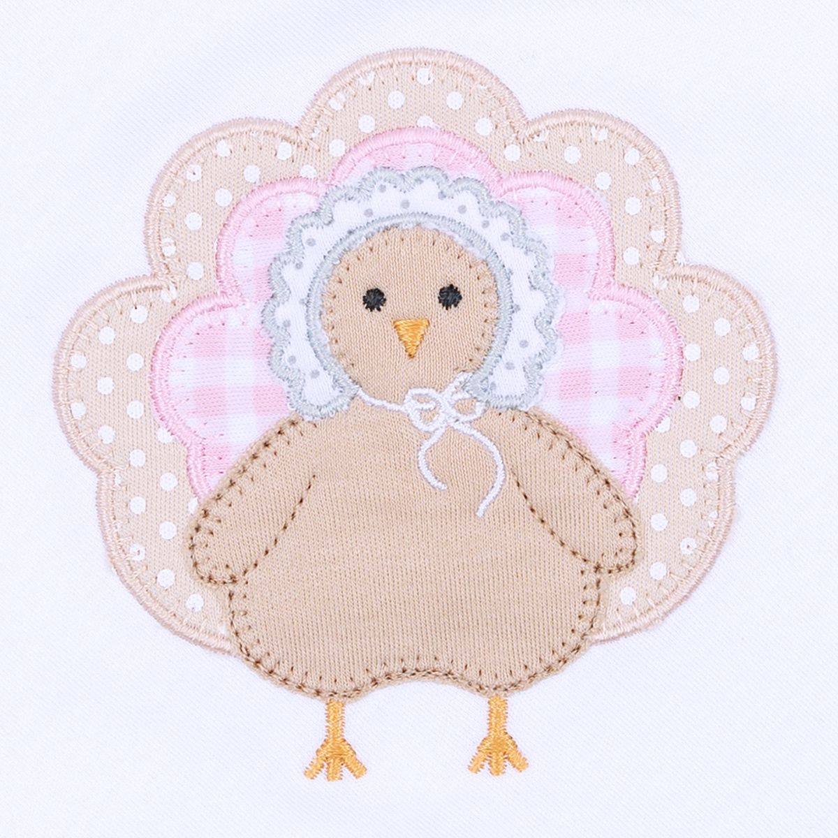 This charming white long sleeve dress features a playful pink gingham collar and ruffle, accented with an adorable turkey embroidery. Perfect for your little one’s festive occasions, it combines comfort with sweet, seasonal style that’s sure to delight.
