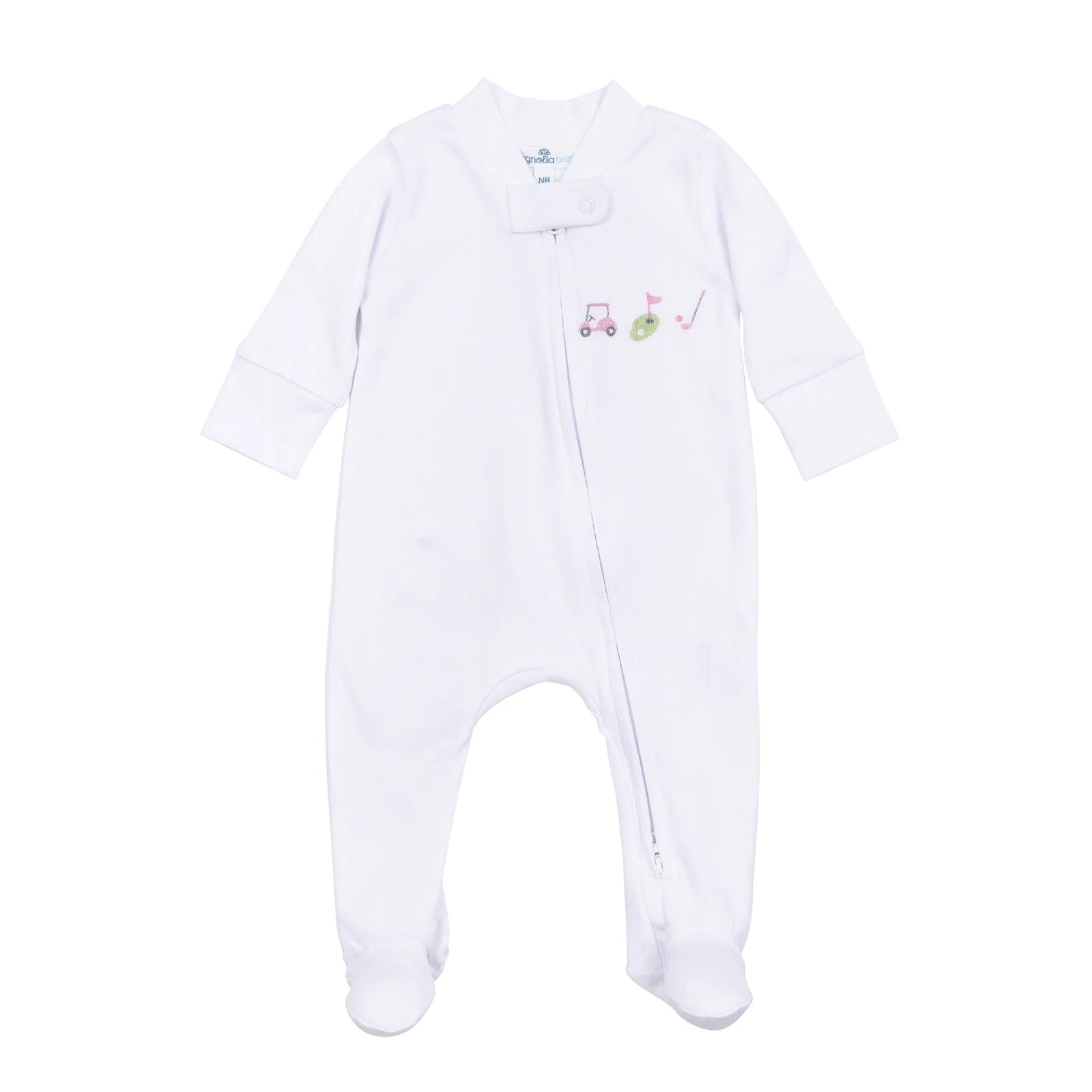 Magnolia Baby - Tiny Tee Time Pink Embroidered Zipper Footie