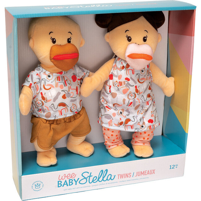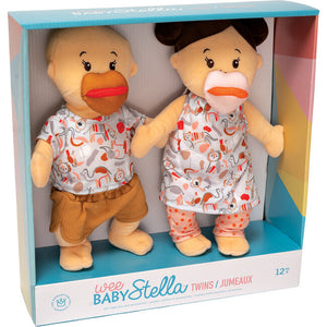 Say Hello to double the fun with Wee Baby Stella Peach Twins! Packaged together, this adorable pair of soft and cuddly 12-inch baby dolls have the same lifelike qualities as her bigger 15-inch Baby Stella cousin and comes with pacifiers that attaches magnetically to their mouths. Wee Baby Stella by Manhattan Toy is an ideal first baby doll collection that will encourage little ones to role play, nurture and care.