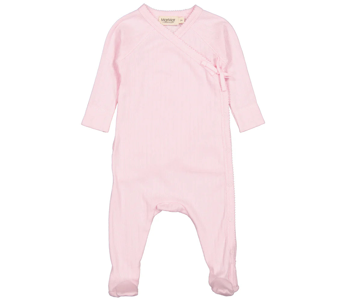 Long-sleeved jumpsuit with feet for newborns. The jumpsuit has a wrap-around closure and closes with snaps and ties from the neck down one leg. The jumpsuit is soft, stretchy and comfortable to wear.