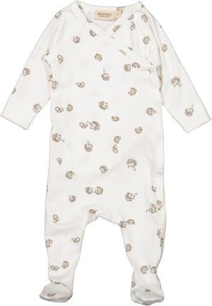 Long-sleeved wrap romper with footies and with a cute moon print. The romper is closed with snap buttons from the neck and along one leg