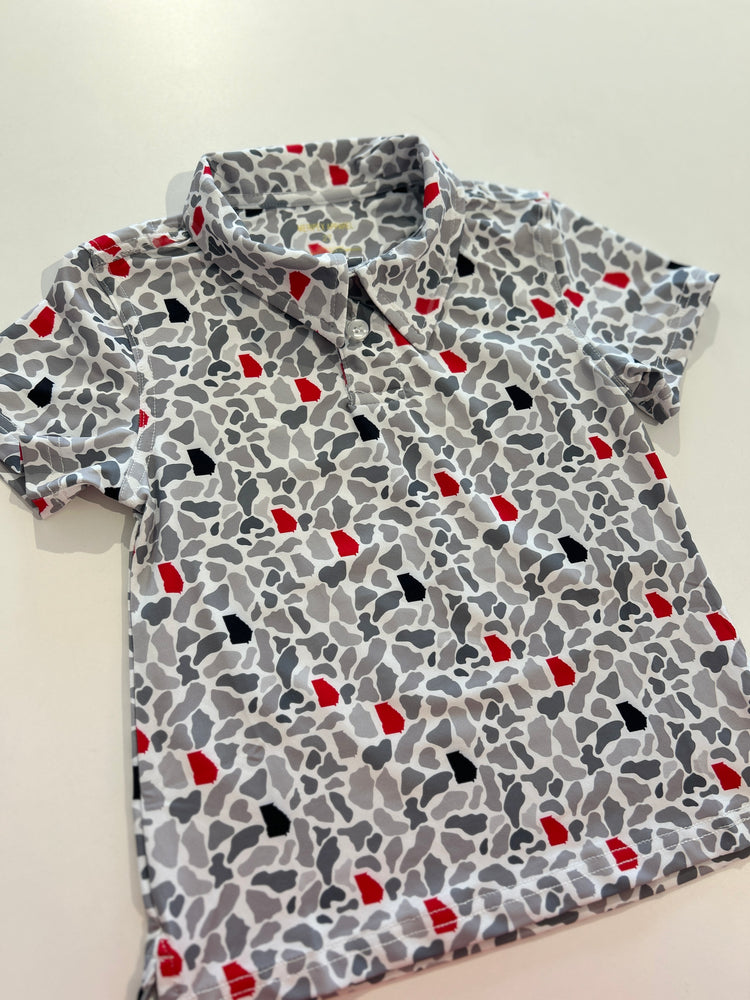 Elevate your style with our Meripex camouflage performance polo featuring the iconic red state of Georgia. Show your support for your team and state with this luxurious and exclusive piece. Perfect for any occasion, this polo will add a touch of sophistication and elegance to your wardrobe.
