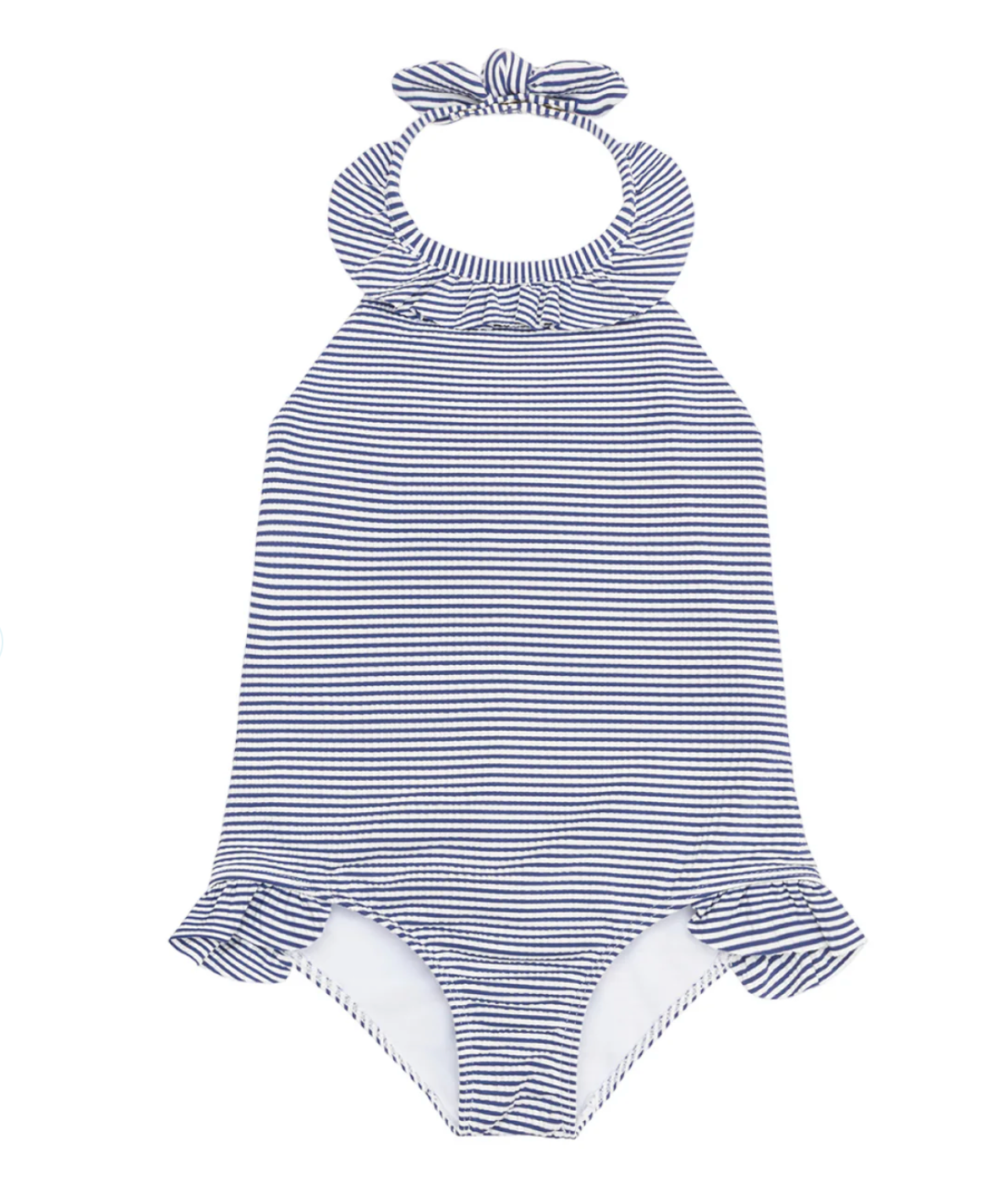 Splash into fun with our brand-new girls' swimwear! This delightful one piece sports an adjustable halter top and playful ruffle details. Fully lined for comfort and coverage, it's the perfect swimming buddy for water adventures and sunshine-filled days! Dive in and make waves in Harbor Stripe style!
