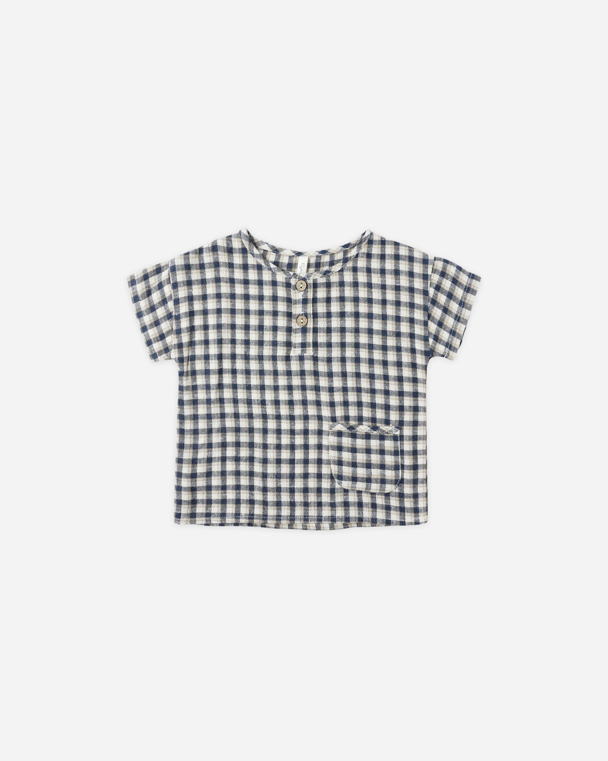 This short sleeve Woven Henley Tee is thoughtfully designed with a button-front placket, and a functional front pocket for a timeless, tailored look.