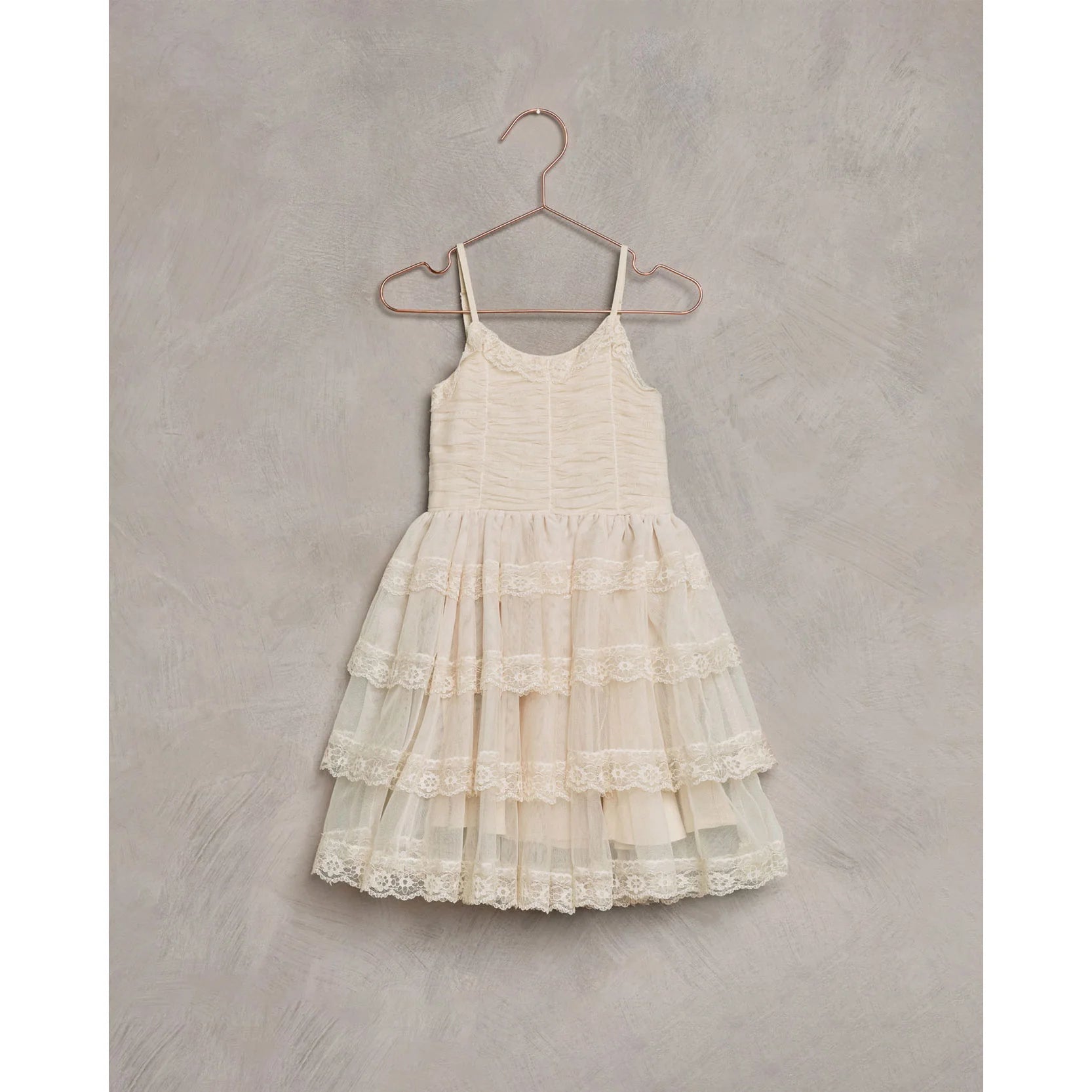 Our vintage-inspired Audrey Dress features a tulle ruched bodice, layered tea length skirt, and lace trim. Designed with a side zip closure and adjustable straps for a perfect fit.