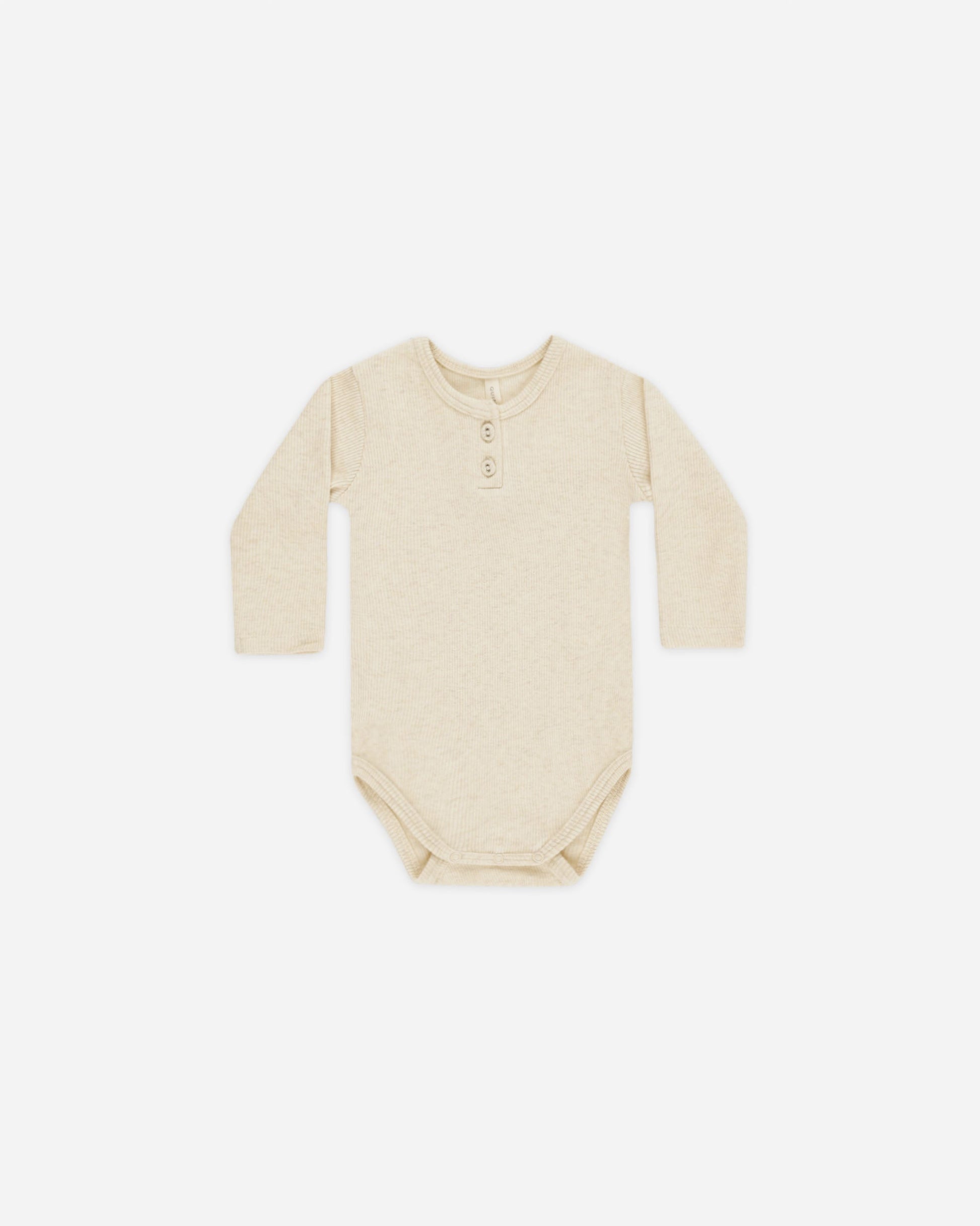 Our Henley Long Sleeve Bodysuit, made from our ribbed melange knit, features a two-button placket at the center front and bottom snaps for easy changes. Pair with our Ribbed Leggings to complete your little one's look.