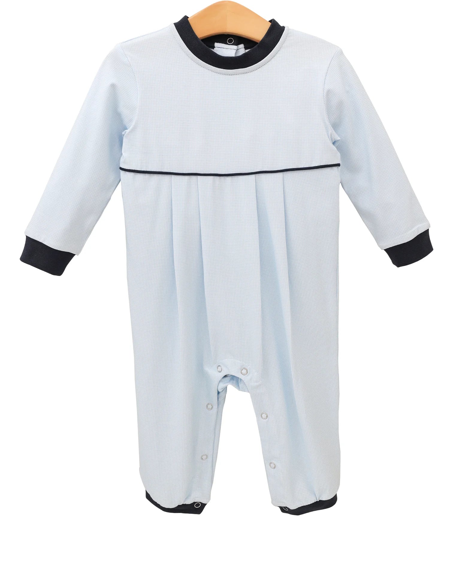 Calling all little adventurers! Our Patrick Romper is ready for fall fun with its charming mini blue gingham print and dashing navy blue trim. This long-sleeve wonder gives your boy the freedom to climb, explore, and giggle his way through autumn days. Perfect for playground escapades or family photos that'll have everyone saying "aww!" Playful style meets comfy design in this seasonal must-have!