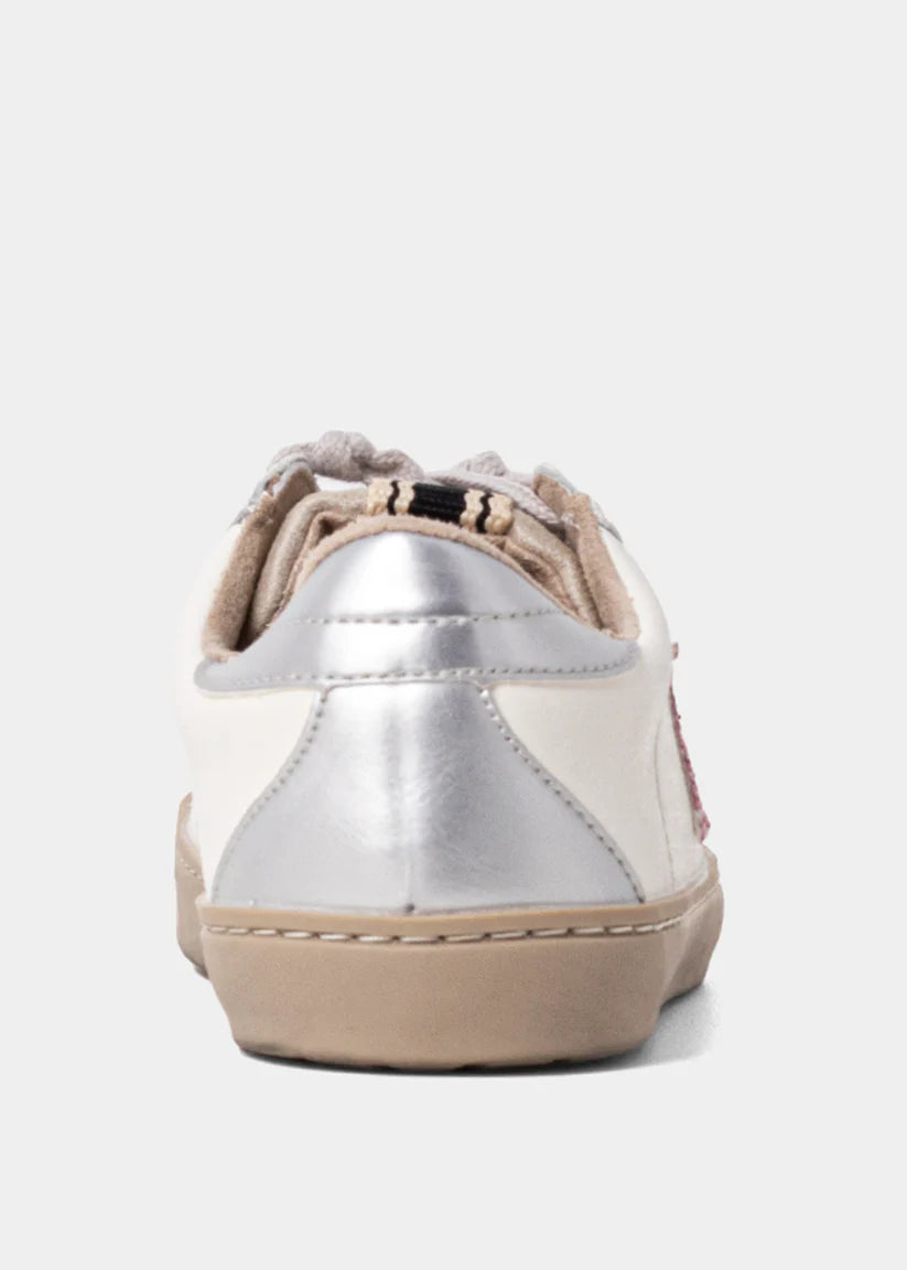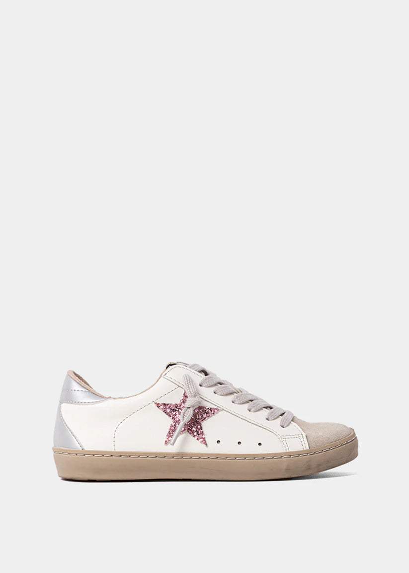 The PAULA MINI in Rose Glitter features a white faux leather base, a pink glitter star, and silver metallic accents at the heel. A soft beige suede touch and cotton laces bring balance to the design, making it effortlessly easy to pair with any outfit. Perfect for adding a touch of sparkle, without compromising on comfort.