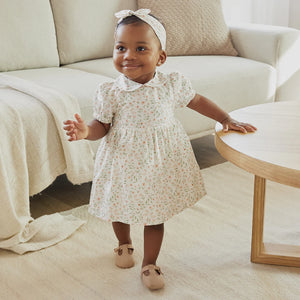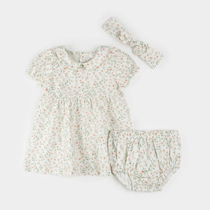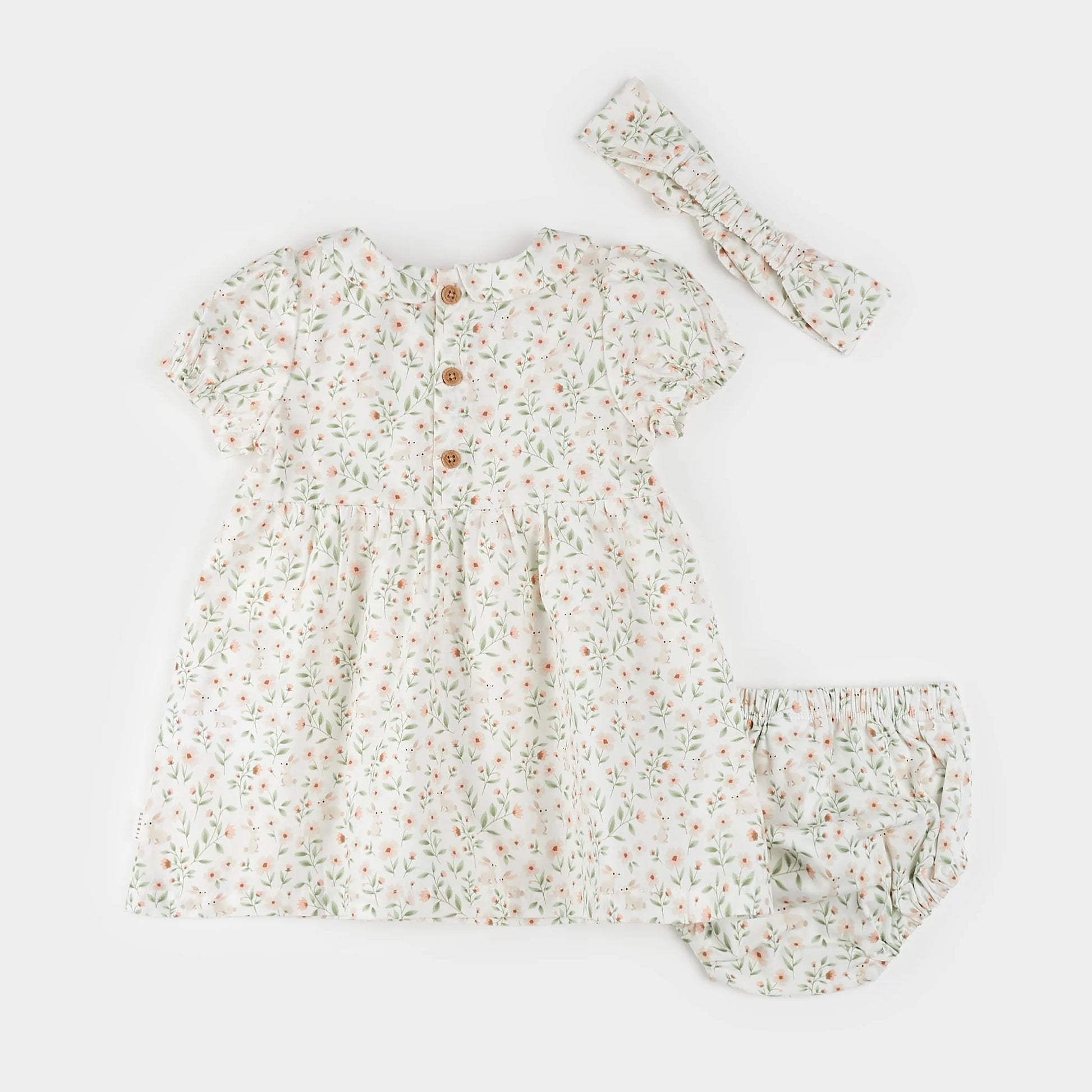 This adorable dress set has everything she needs to feel comfortable and fabulous – a combination we all deserve. Decorated with our Spring Bunnies print, the set is perfect for tea parties and special occasions in the warmer seasons. The 3-piece set features a pretty tea dress with a Peter-pan collar, a diaper cover for layering underneath and a matching headband to complete the look. The elasticated pants allow her to twirl, dance and explore comfortably, while the button placket at the back of the dress ensures over-the-head dressing is a total breeze.