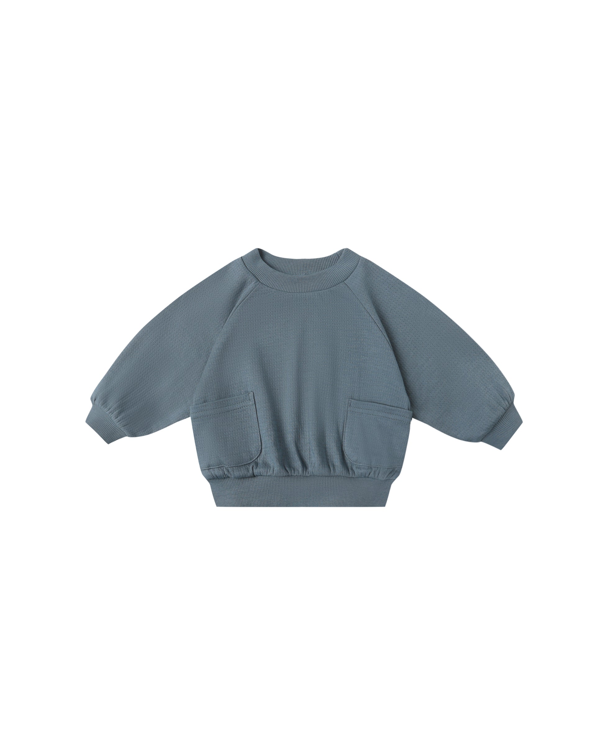 Our Pocket Sweatshirt is crafted from soft pointelle fabric and features gathered sleeves and front patch pockets for subtle charm. An instant classic, it pairs effortlessly with our Sweatpants or layers easily over all your Quincy Mae favorites.
