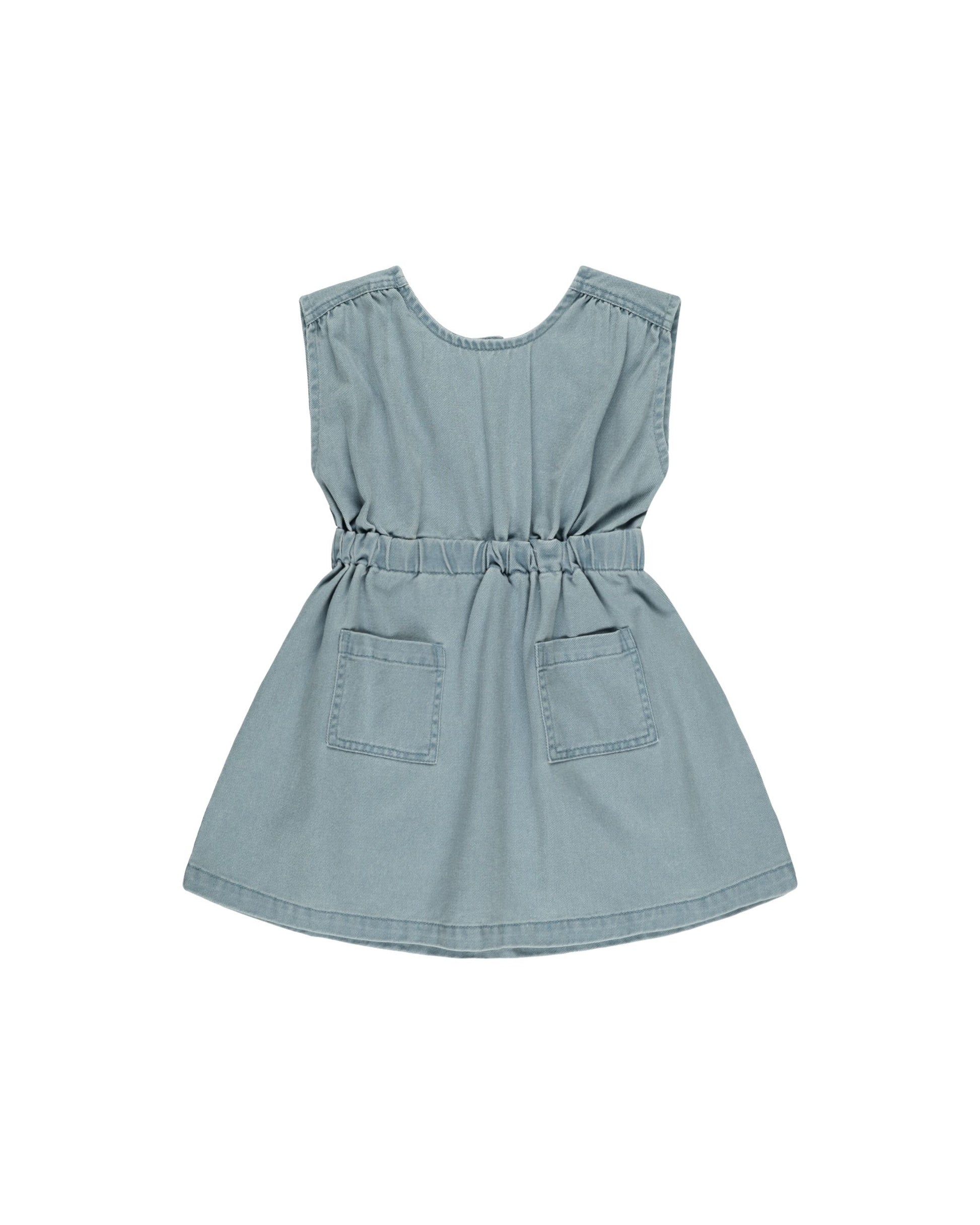 Lightweight denim a-line mini dress with front patch pockets, a triangular back cutout that comes together with a snap at the back neck, and elastic casing at the waist.