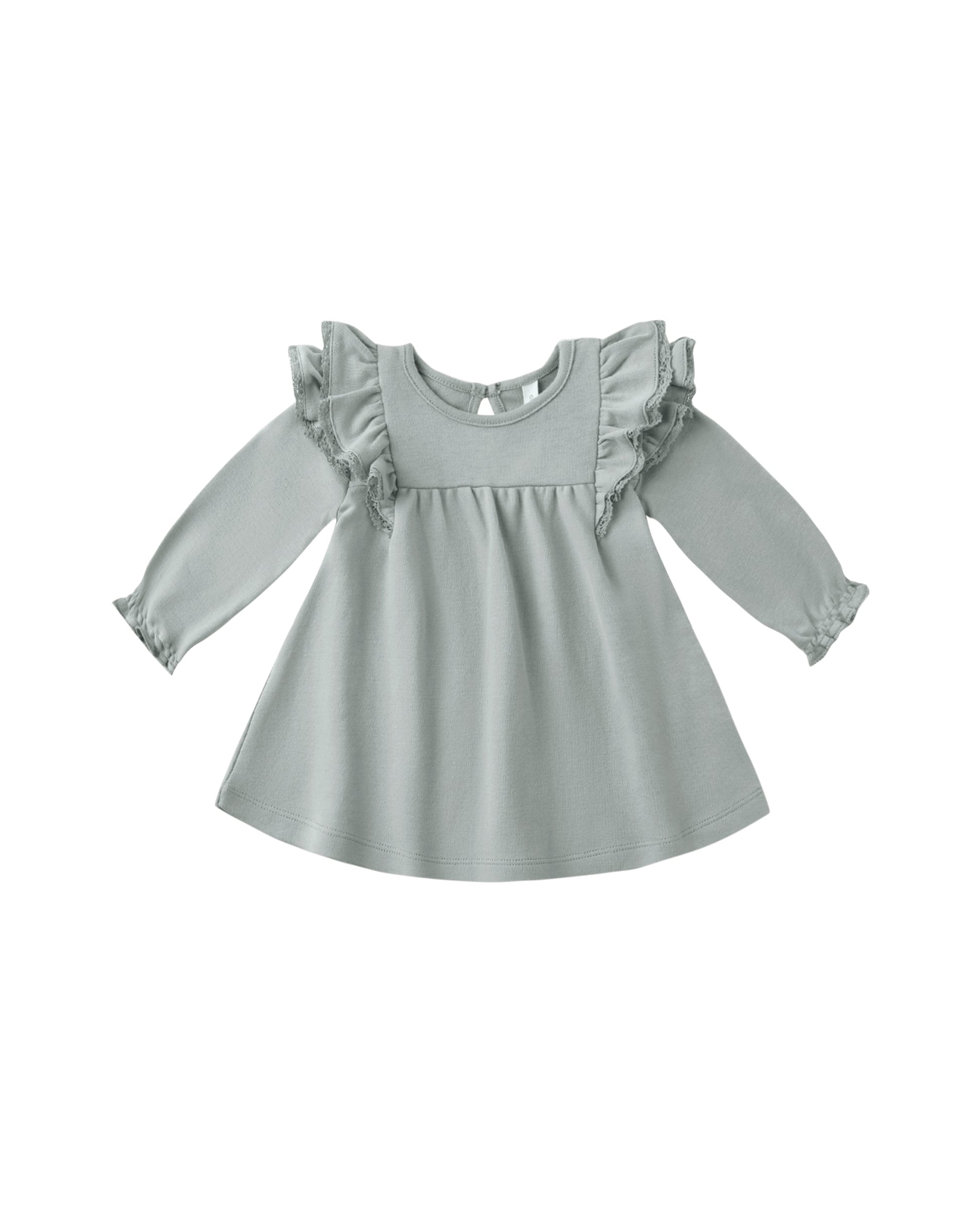 Velvety soft flutter long sleeve baby dress with a button back neck closure. Coordinating bloomers included with all sizes.
