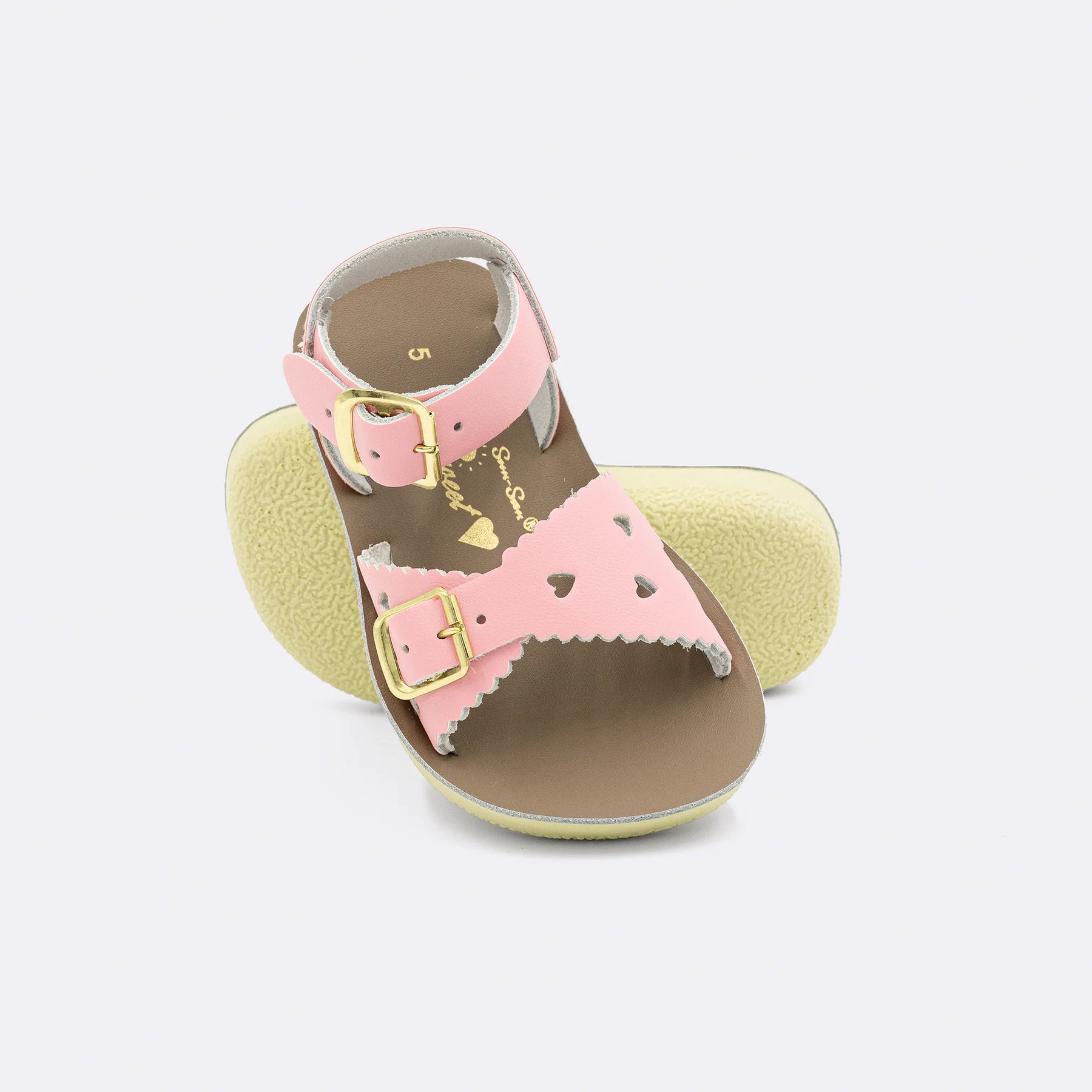 The Sun-San Sweetheart is a pretty sandal with heart-shape cutouts and scalloped edges. It’s fully adjustable with a buckled toe and ankle straps. As seen on many celebrities’ kids, the Sweetheart is a popular choice. The combination of comfort, durability and fashion make these a wear-anywhere sandal.