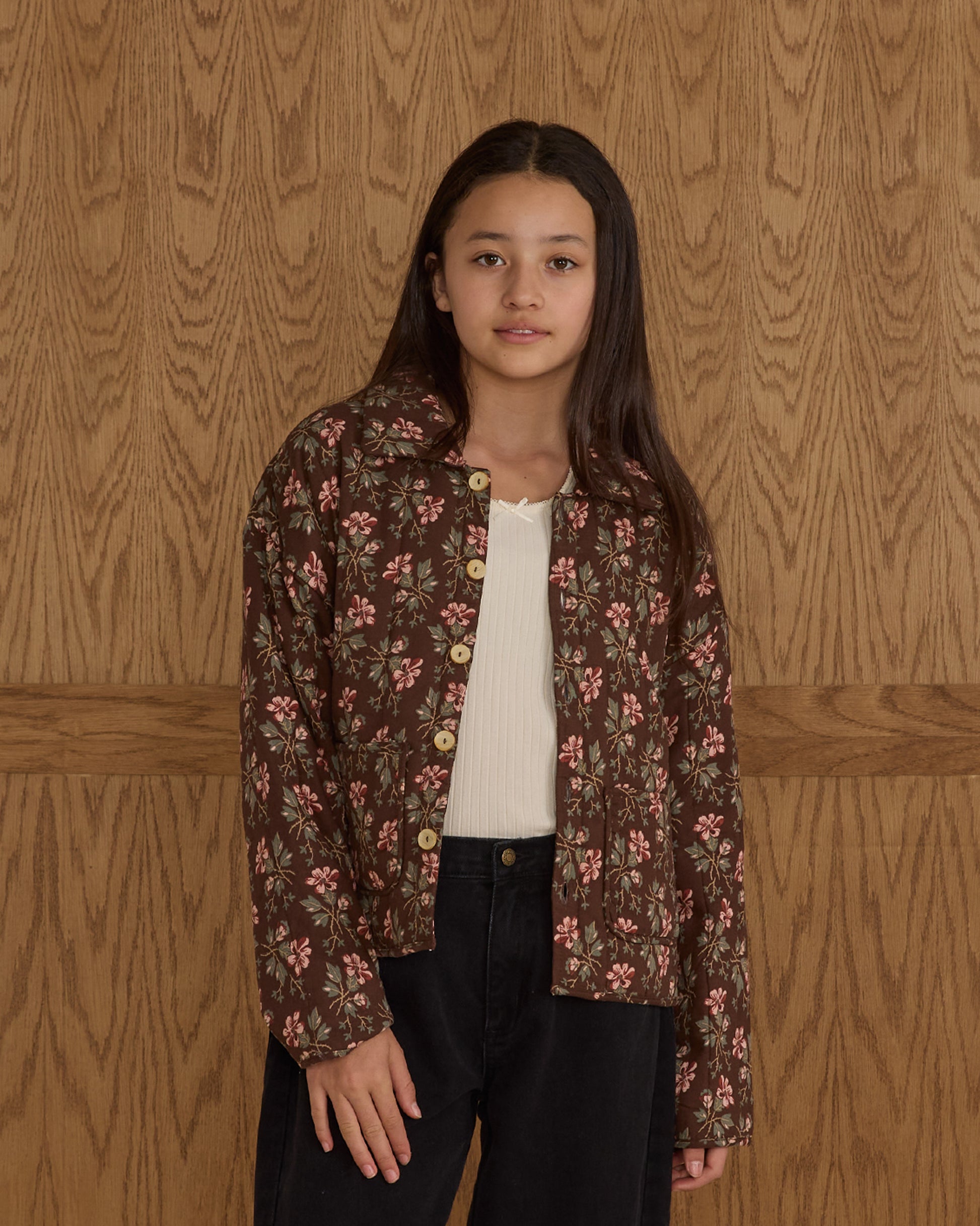 Our Quilted Collar Jacket has a cute peter pan collar and mango buttons along the center front. It has pockets along the bottom of the coat as well for all outdoor activities.